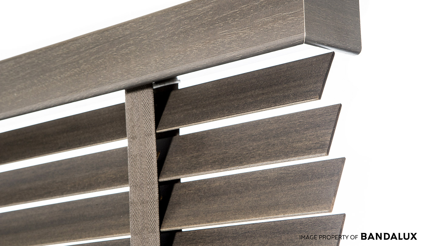 Los mecanismos de funcionamiento quedan alojados dentro del cabezal, que a su vez está recubierto por una galería de madera. El riel inferior está compuesto por un perfil de madera, todo ello en el mismo color y acabado de las lamas.